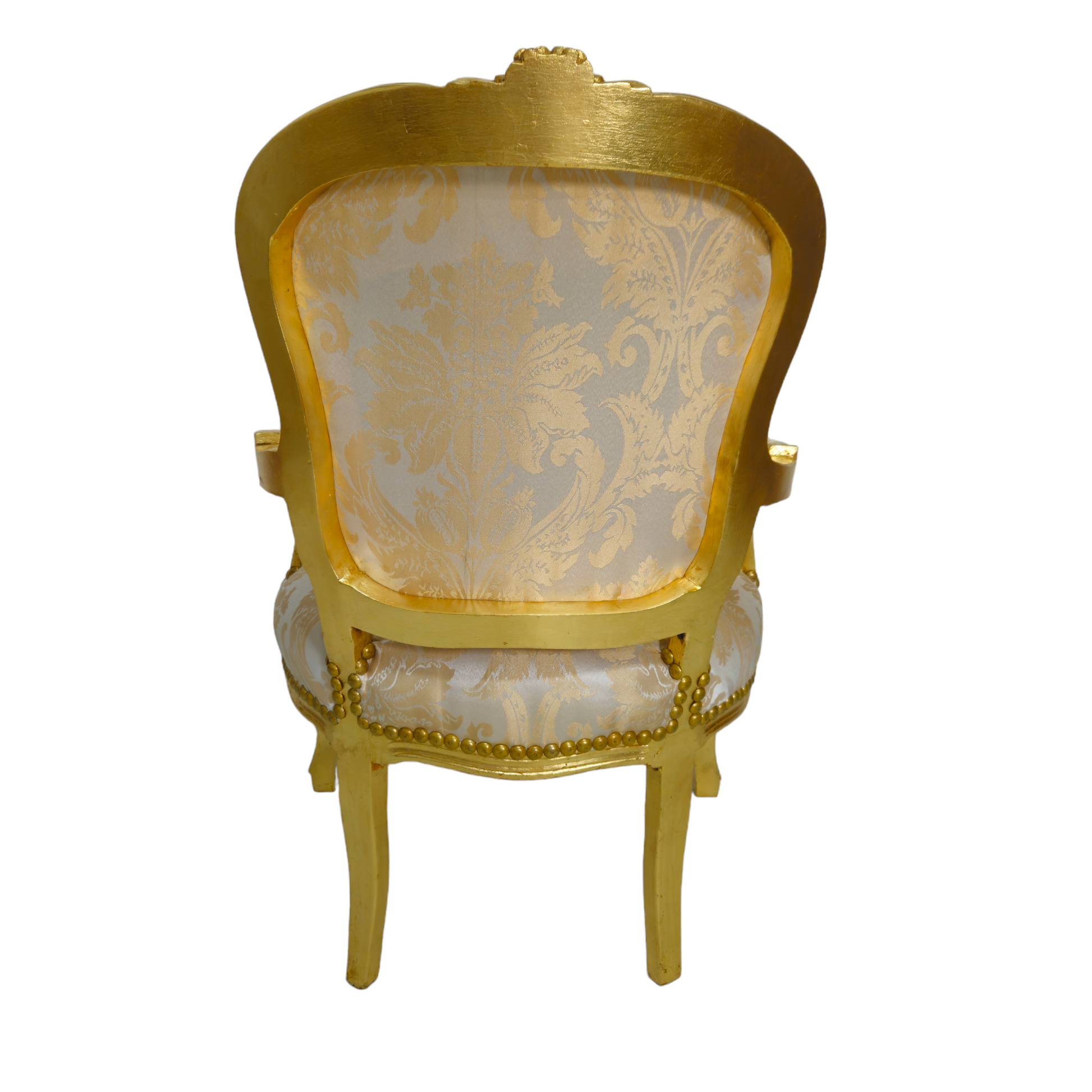 De stoel is bekleed met een hoogwaardige stof met gouden accenten. Deze opvallende gouden bekleding geeft de stoel een unieke en luxueuze uitstraling, perfect voor zowel moderne als klassieke interieurs. De combinatie van het barokke ontwerp en de crème gouden bekleding maakt deze stoel een echte blikvanger in elke ruimte.